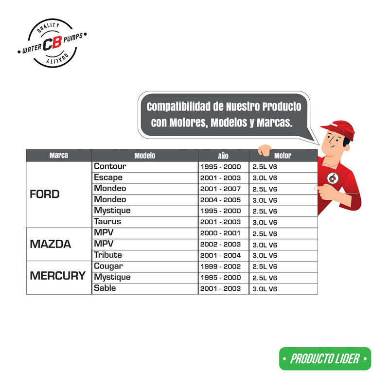 WATER PUMP WITH NEW BASE PREMIUM QUALITY INCLUDES: • Aluminum impeller. • Base. • Suitable for Car/Truck. Improve the lifespan of your car. •Greater durability. •Water leak correction. •Free Shipping Nationwide. •100% Secure Purchase. To ensure your purchase is a good experience, we suggest observing the following points: 1.- COMPATIBILITY OF THE PART • Check that the part is compatible with your vehicle, compare it with the published photos and information. • Review Compatibility Table. 2.- DELIVERY TIME • Depending on your location is the time of reception of the product. • Enter your Zip Code to find out the Shipping Time and Methods. • Logistics, delivery times, and packaging depend on Mercado Libre. 3.- WARRANTY • All our products have a 60-day warranty (from the date you receive your product). • A broken, wet, burned, rusty and/or scale-infected part invalidates the warranty. 4.- INVOICE • Upon receiving your product, you can generate your invoice online (We'll send you the link in the purchase chat). 5.- RETURNS • The piece must come in good condition and with all accessories included. • Returns are not accepted if it has already been installed or used in your car. We are a Pumping Station with 50 years of experience. • Specialists in the Sale of Automotive Water Pumps. • For Diesel and Gasoline Engines. • All Brands and Applications (Cars, Trucks, Forklifts, Power Plants, Tractors).