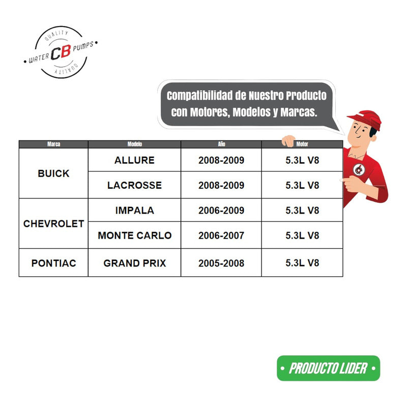 NEW WATER PUMP PREMIUM QUALITY INCLUDES: • Metal Impeller. • Installation Packaging. • Suitable for Car. Improve the lifespan of your car. •Greater durability. •Water leak correction. •Free Shipping Nationwide. •100% Secure Purchase. To ensure your purchase is a good experience, we suggest observing the following points: 1.- PART COMPATIBILITY • Check that the part is compatible with your vehicle, compare it with the published photos and information. • Review Compatibility Table. 2.- DELIVERY TIME • Depending on your location is the time of reception of the product. • Enter your Zip Code to find out the Shipping Time and Methods. • Logistics, delivery times, and packaging depend on Mercado Libre. 3.- WARRANTY • All our products have a 60-day warranty (from the date you receive your product). • A broken, wet, burned, rusty and/or scale-infected part invalidates the warranty. 4.- INVOICE • Upon receiving your product, you can generate your invoice online (We'll send you the link in the purchase chat). 5.- RETURNS • The piece must come in good condition and with all accessories included. • Returns are not accepted if it has already been installed or used in your car. We are a Pumping Station with 50 years of experience. • Specialists in the Sale of Automotive Water Pumps. • For Diesel and Gasoline Engines. • All Brands and Applications (Cars, Trucks, Forklifts, Power Plants, Tractors).