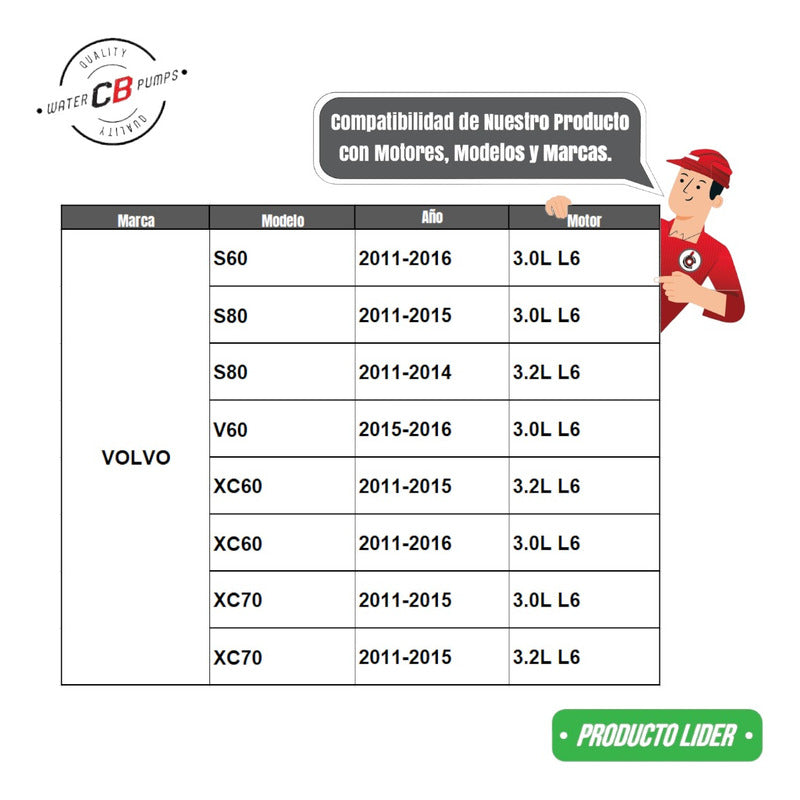 NEW WATER PUMP PREMIUM QUALITY INCLUDES: • Metal Impeller. • Installation Packaging. • Suitable for Car/Truck. Improve the lifespan of your car. •Greater durability. •Water leak correction. •Free Shipping Nationwide. •100% Secure Purchase. To ensure your purchase is a good experience, we suggest observing the following points: 1.- COMPATIBILITY OF THE PART • Check that the part is compatible with your vehicle, compare it with the published photos and information. • Review Compatibility Table. 2.- DELIVERY TIME • Depending on your location is the time of reception of the product. • Enter your Zip Code to find out the Shipping Time and Methods. • Logistics, delivery times, and packaging depend on Mercado Libre. 3.- WARRANTY • All our products have a 60-day warranty (from the date you receive your product). • A broken, wet, burned, rusty and/or scale-infected part invalidates the warranty. 4.- INVOICE • Upon receiving your product, you can generate your invoice online (We'll send you the link in the purchase chat). 5.- RETURNS • The piece must come in good condition and with all accessories included. • Returns are not accepted if it has already been installed or used in your car. We are a Pumping Station with 50 years of experience. • Specialists in the Sale of Automotive Water Pumps. • For Diesel and Gasoline Engines. • All Brands and Applications (Cars, Trucks, Forklifts, Power Plants, Tractors).