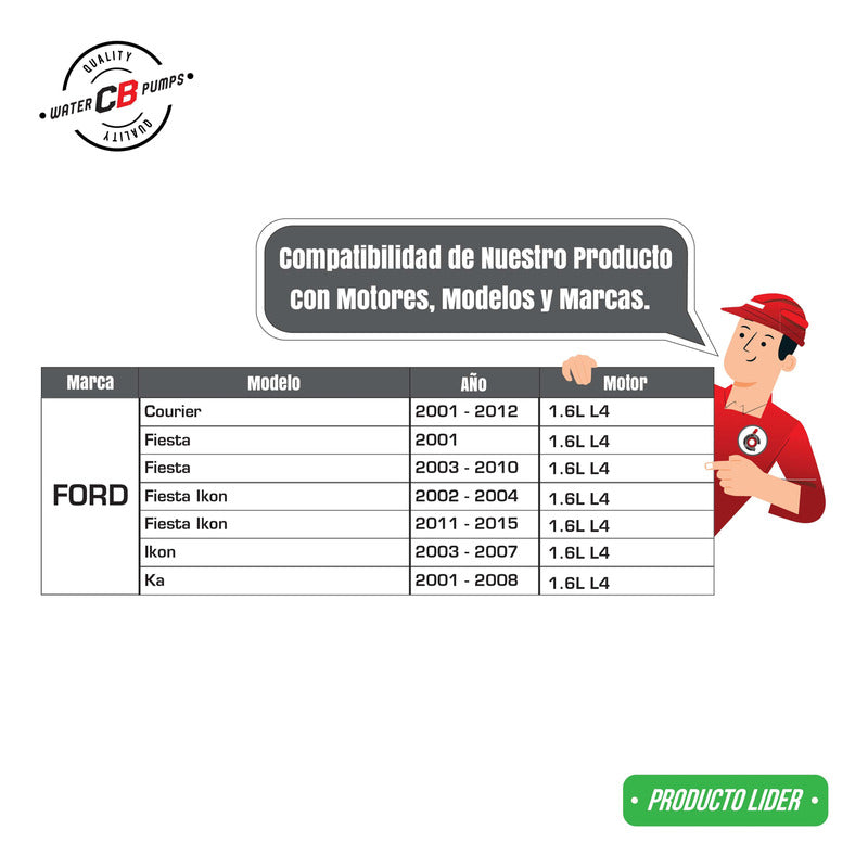 NEW WATER PUMP PREMIUM QUALITY INCLUDES: • Metal Impeller. • Installation Packaging. • Suitable for Car. Improve the lifespan of your car. •Greater durability. •Water leak correction. •Free Shipping Nationwide. •100% Secure Purchase. To ensure your purchase is a good experience, we suggest observing the following points: 1.- COMPATIBILITY OF THE PART • Check that the part is compatible with your vehicle, compare it with the published photos and information. • Review Compatibility Table. 2.- DELIVERY TIME • Depending on your location is the time of reception of the product. • Enter your Zip Code to find out the Shipping Time and Methods. • Logistics, delivery times, and packaging depend on Mercado Libre. 3.- WARRANTY • All our products have a 60-day warranty (from the date you receive your product). • A broken, wet, burned, rusty and/or scale-infected part invalidates the warranty. 4.- INVOICE • Upon receiving your product, you can generate your invoice online (We'll send you the link in the purchase chat). 5.- RETURNS • The piece must come in good condition and with all accessories included. • Returns are not accepted if it has already been installed or used in your car. We are a Pumping Station with 50 years of experience. • Specialists in the Sale of Automotive Water Pumps. • For Diesel and Gasoline Engines. • All Brands and Applications (Cars, Trucks, Forklifts, Power Plants, Tractors).