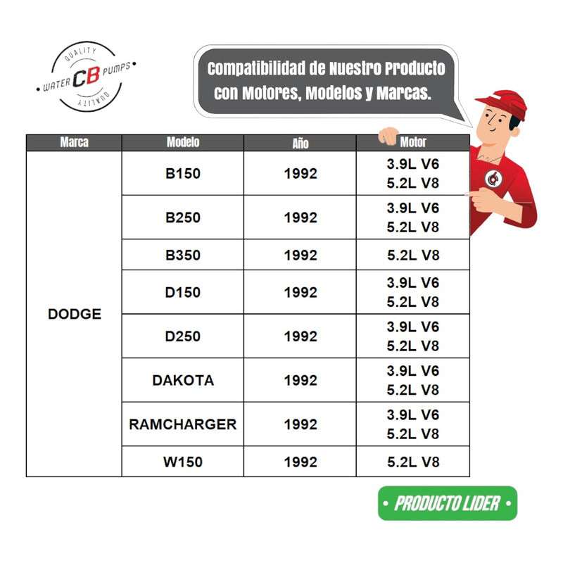NEW WATER PUMP PREMIUM QUALITY INCLUDES: • Metal Impeller. • Bring rope for the tube. • Installation Packaging. • Suitable for Car/Truck. Improve the lifespan of your car. •Greater durability. •Water leak correction. •Free Shipping Nationwide. •100% Secure Purchase. To ensure your purchase is a good experience, we suggest observing the following points: 1.- COMPATIBILITY OF THE PART • Check that the part is compatible with your vehicle, compare it with the published photos and information. • Review Compatibility Table. 2.- DELIVERY TIME • Depending on your location is the time of reception of the product. • Enter your Zip Code to find out the Shipping Time and Methods. • Logistics, delivery times, and packaging depend on Mercado Libre. 3.- WARRANTY • All our products have a 60-day warranty (from the date you receive your product). • A broken, wet, burned, rusty and/or scale-infected part invalidates the warranty. 4.- INVOICE • Upon receiving your product, you can generate your invoice online (We'll send you the link in the purchase chat). 5.- RETURNS • The piece must come in good condition and with all accessories included. • Returns are not accepted if it has already been installed or used in your car. We are a Pumping Station with 50 years of experience. • Specialists in the Sale of Automotive Water Pumps. • For Diesel and Gasoline Engines. • All Brands and Applications (Cars, Trucks, Forklifts, Power Plants, Tractors).