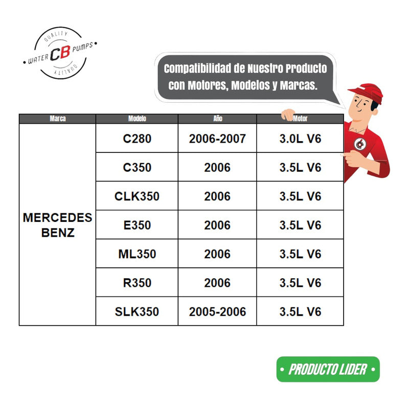 NEW WATER PUMP PREMIUM QUALITY INCLUDES: • Metal Impeller. • Installation Packaging. • Suitable for Car/Truck. Improve the lifespan of your car. •Greater durability. •Water leak correction. •Free Shipping Nationwide. •100% Secure Purchase. To ensure your purchase is a good experience, we suggest observing the following points: 1.- COMPATIBILITY OF THE PART • Check that the part is compatible with your vehicle, compare it with the published photos and information. • Review Compatibility Table. 2.- DELIVERY TIME • Depending on your location is the time of reception of the product. • Enter your Zip Code to find out the Shipping Time and Methods. • Logistics, delivery times, and packaging depend on Mercado Libre. 3.- WARRANTY • All our products have a 60-day warranty (from the date you receive your product). • A broken, wet, burned, rusty and/or scale-infected part invalidates the warranty. 4.- INVOICE • Upon receiving your product, you can generate your invoice online (We'll send you the link in the purchase chat). 5.- RETURNS • The piece must come in good condition and with all accessories included. • Returns are not accepted if it has already been installed or used in your car. We are a Pumping Station with 50 years of experience. • Specialists in the Sale of Automotive Water Pumps. • For Diesel and Gasoline Engines. • All Brands and Applications (Cars, Trucks, Forklifts, Power Plants, Tractors).