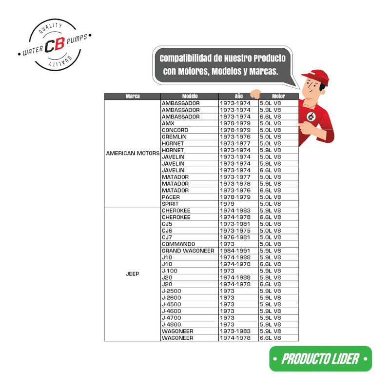 NEW WATER PUMP PREMIUM QUALITY INCLUDES: • Aluminum impeller. • Installation Packaging • Suitable for Trucks. Improve the lifespan of your truck. •Greater durability. •Water leak correction. •Free Shipping Nationwide. •100% Secure Purchase. To ensure your purchase is a good experience, we suggest observing the following points: 1.- COMPATIBILITY OF THE PART • Check that the part is compatible with your vehicle, compare it with the published photos and information. • Review Compatibility Table. 2.- DELIVERY TIME • Depending on your location is the time of reception of the product. • Enter your Zip Code to find out the Shipping Time and Methods. • Logistics, delivery times, and packaging depend on Mercado Libre. 3.- WARRANTY • All our products have a 60-day warranty (from the date you receive your product). • A broken, wet, burned, rusty and/or scale-infected part invalidates the warranty. 4.- INVOICE • Upon receiving your product, you can generate your invoice online (We'll send you the link in the purchase chat). 5.- RETURNS • The piece must come in good condition and with all accessories included. • Returns are not accepted if it has already been installed or used in your car. We are a Pumping Station with 50 years of experience. • Specialists in the Sale of Automotive Water Pumps. • For Diesel and Gasoline Engines. • All Brands and Applications (Cars, Trucks, Forklifts, Power Plants, Tractors).