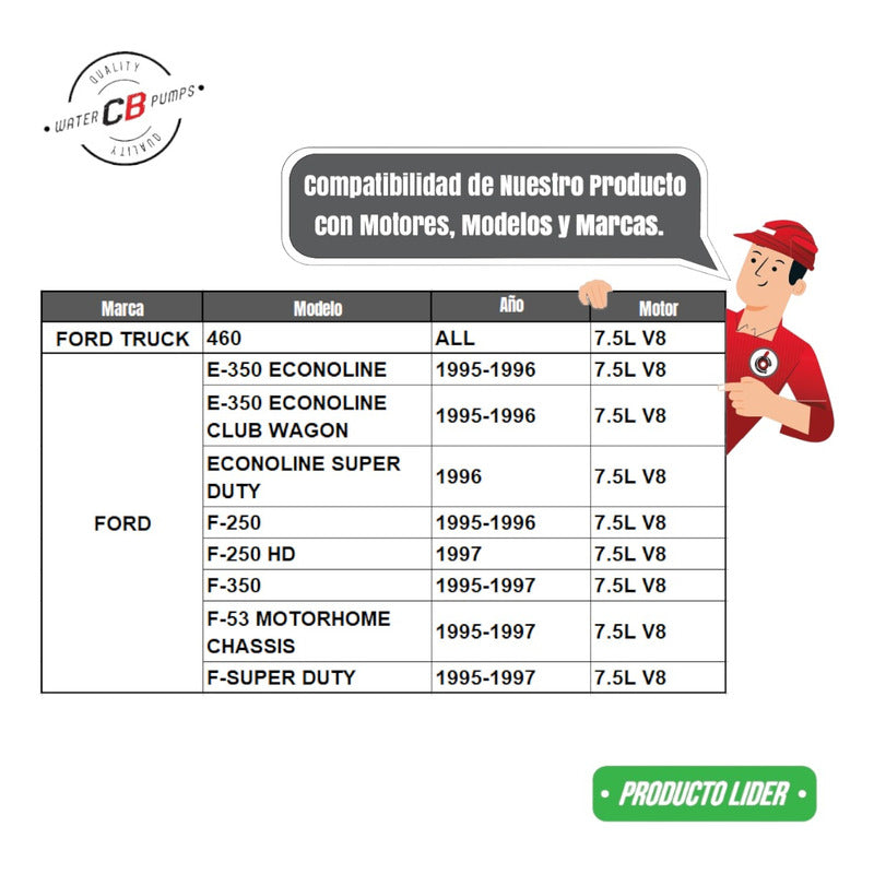 NEW WATER PUMP PREMIUM QUALITY INCLUDES: • Metallic Impeller. • Installation Packaging. • Suitable for Truck / Van. Improve the lifespan of your truck. •Greater durability. •Water leak correction. •Free Shipping Nationwide. •100% Secure Purchase. To ensure your purchase is a good experience, we suggest observing the following points: 1.- COMPATIBILITY OF THE PART • Check that the part is compatible with your vehicle, compare it with the published photos and information. • Review Compatibility Table. 2.- DELIVERY TIME • Depending on your location is the time of reception of the product. • Enter your Zip Code to find out the Shipping Time and Methods. • Logistics, delivery times, and packaging depend on Mercado Libre. 3.- WARRANTY • All our products have a 60-day warranty (from the date you receive your product). • A broken, wet, burned, rusty and/or scale-infected part invalidates the warranty. 4.- INVOICE • Upon receiving your product, you can generate your invoice online (We'll send you the link in the purchase chat). 5.- RETURNS • The piece must come in good condition and with all accessories included. • Returns are not accepted if it has already been installed or used in your car. We are a Pumping Station with 50 years of experience. • Specialists in the Sale of Automotive Water Pumps. • For Diesel and Gasoline Engines. • All Brands and Applications (Cars, Trucks, Forklifts, Power Plants, Tractors).