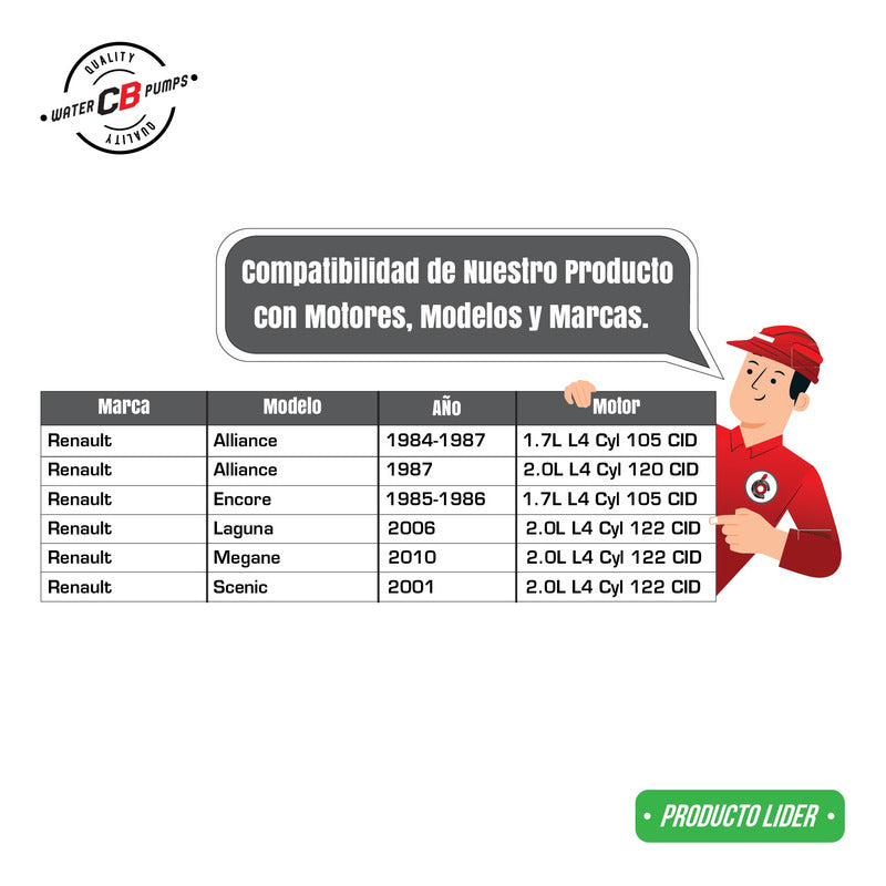 NEW WATER PUMP PREMIUM QUALITY INCLUDES: • Metal Impeller. • Installation Packaging. • Suitable for Car/Truck. Improve the lifespan of your car. •Greater durability. •Water leak correction. •Free Shipping Nationwide. •100% Secure Purchase. To ensure your purchase is a good experience, we suggest observing the following points: 1.- COMPATIBILITY OF THE PART • Check that the part is compatible with your vehicle, compare it with the published photos and information. • Review Compatibility Table. 2.- DELIVERY TIME • Depending on your location is the time of reception of the product. • Enter your Zip Code to find out the Shipping Time and Methods. • Logistics, delivery times, and packaging depend on Mercado Libre. 3.- WARRANTY • All our products have a 60-day warranty (from the date you receive your product). • A broken, wet, burned, rusty and/or scale-infected part invalidates the warranty. 4.- INVOICE • Upon receiving your product, you can generate your invoice online (We'll send you the link in the purchase chat). 5.- RETURNS • The piece must come in good condition and with all accessories included. • Returns are not accepted if it has already been installed or used in your car. We are a Pumping Station with 50 years of experience. • Specialists in the Sale of Automotive Water Pumps. • For Diesel and Gasoline Engines. • All Brands and Applications (Cars, Trucks, Forklifts, Power Plants, Tractors).