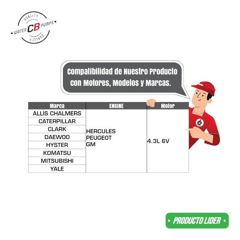 BOMBA DE AGUA NUEVA CALIDAD PREMIUM INCLUYE: • Impulsor de Metal. • Empaque de Instalación. • Apto para Montacargas/Motor Industrial. Mejora la vida útil de tu Montacargas. •Mayor durabilidad. •Corrección de fuga de Agua. •Envío Gratis a Todo el País. •Compra 100% Segura. Para que su compra sea una buena experiencia sugerimos observar los siguientes puntos: 1.- COMPATIBILIDAD DE LA PIEZA • Revise que la pieza sea compatible con su vehículo, compare con las fotos e información publicadas. • Revisar Tabla de Compatibilidades. 2.- TIEMPO DE ENTREGA • Dependiendo de su Localidad es el tiempo de recepción del producto. • Ingresa tu Código Postal para saber el Tiempo y formas de Envío. • La logística, tiempos de entrega y la paquetería, dependen de Mercado Libre. 3.- GARANTÍA • Todos nuestros productos tienen garantía válida por 30 días (A partir de la fecha de recibido su producto). • Pieza rota, mojada, quemada, con presencia de oxidación y/o sarro invalida la garantía. 4.- FACTURA • Al recibir su producto puede generar su factura en línea (Le enviamos su link en el chat de compra). 5.- DEVOLUCIONES • La pieza debe venir en buen estado y con todos los aditamentos incluidos. • No se aceptan devoluciones si ya fue instalada o usada en su auto. Somos Central de Bombas con 50 años de experiencia. • Especialistas en Venta de Bombas de Agua Automotrices. • Para Motores Diesel y Gasolina. • Todas las Marcas y Aplicaciones (Autos, Camiones, Montacargas, Plantas de Luz, Tractores).