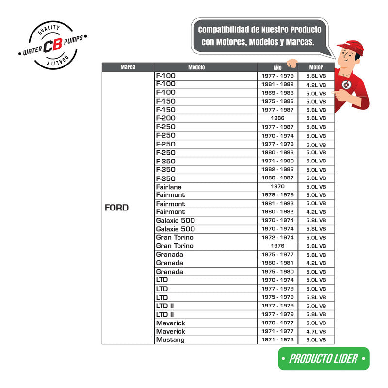 BOMBA DE AGUA NUEVA CALIDAD PREMIUM IMPORTANTE: Esta bomba de agua SOLO es compatible con motores CARBURADOS, por favor verifica esta información en tu vehículo y revisa físicamente tu bomba antes de comprar pues hay varias bombas similares, cualquier duda comunícate con nosotros, estamos para servirte. INCLUYE: • Impulsor de Lámina. • Empaque de Instalación. • Apto para Auto/Camioneta. Mejora la vida útil de tu Auto/Camioneta. •Mayor durabilidad. •Corrección de fuga de Agua. •Envío Gratis a Todo el País. •Compra 100% Segura. Para que su compra sea una buena experiencia sugerimos observar los siguientes puntos: 1.- COMPATIBILIDAD DE LA PIEZA • Revise que la pieza sea compatible con su vehículo, compare con las fotos e información publicadas. • Revisar Tabla de Compatibilidades. 2.- TIEMPO DE ENTREGA • Dependiendo de su Localidad es el tiempo de recepción del producto. • Ingresa tu Código Postal para saber el Tiempo y formas de Envío. • La logística y tiempos de entrega, dependen de la region del cliente. 3.- GARANTÍA • Todos nuestros productos tienen garantía válida por 30 días (A partir de la fecha de recibido su producto). • Pieza rota, mojada, quemada, con presencia de oxidación y/o sarro invalida la garantía. 4.- FACTURA • Al recibir su producto puede generar su factura en línea (Le enviamos su link en el chat de compra). 5.- DEVOLUCIONES • La pieza debe venir en buen estado y con todos los aditamentos incluidos. • No se aceptan devoluciones si ya fue instalada o usada en su auto. Somos Central de Bombas con 50 años de experiencia. • Especialistas en Venta de Bombas de Agua Automotrices. • Para Motores Diesel y Gasolina. • Todas las Marcas y Aplicaciones (Autos, Camiones, Montacargas, Plantas de Luz, Tractores).