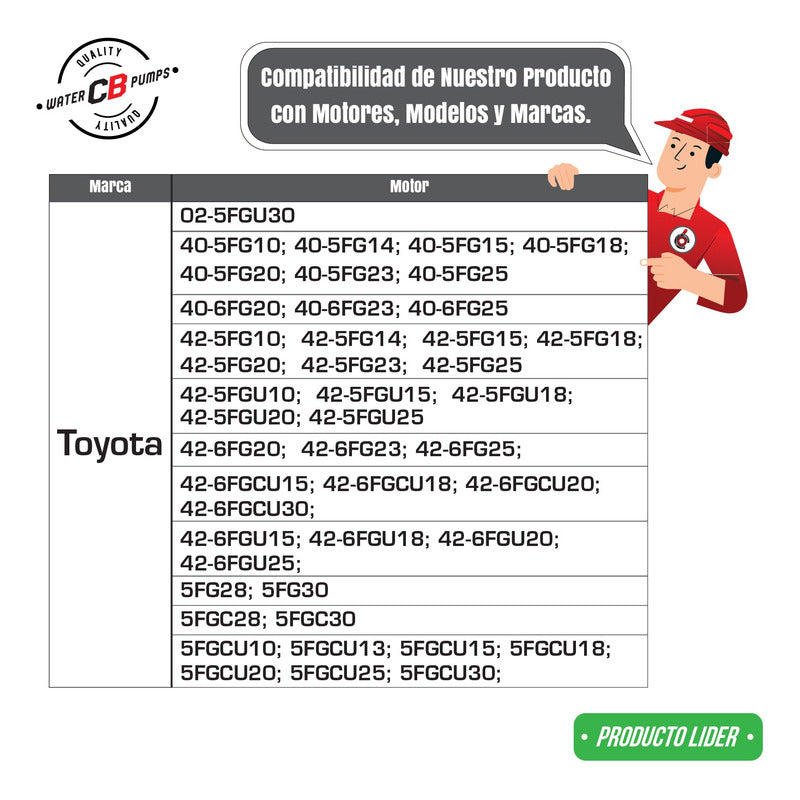 Modelo: Montacargas Toyota 4Y Mitsubishi Clark Hyster Yale 02-5FGU30 40-5FG10,14,15,18,20,23,25 40-6FG20,23,25 42-5FG10,14,15,18,20,23,25 42-5FGU10,15,18,20,25 42-6FG20,23,25 42-6FGCU15,18,20,30 42-6FGU15,18,20,25 5FG28,30 5FGC28,30 5FGCU10,13,15,18,20,25,30 2.2L