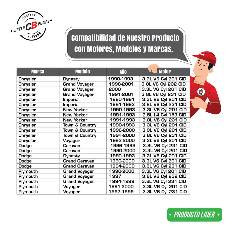 Modelo: CHRYSLER Grand Voyager 1991-1995 1998-2001 3.8l 2000 3.3l Imperial New Yorker 1990-1991 3.3l 1991-1993 3.8l Town &Country 1994-2000 3.8l 1990-1993 1996-2000 3.3l Voyager 1993-2000 3.3l Caravan 1991-2000 3.3 1996-1999 3.8 Dynasty 1990-1993 3.3 V6