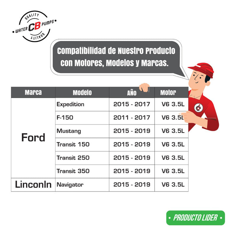 Modelo: Tapa Cubierta Bomba Agua FORD F-150 2012-2022 3.5L Expedition 2015-2020 3.5 Lobo 2015, 2017 3.5 Mustang 2015-2017 3.7 Transit-150 2015-2020 3.5 3.7 Transit-250 2015-2019 3.7 LINCOLN MKS 2011-2014 3.5 MKX 2011-2017 3.7 MKZ 2013-2016 3.7 Navigator 2015-2019