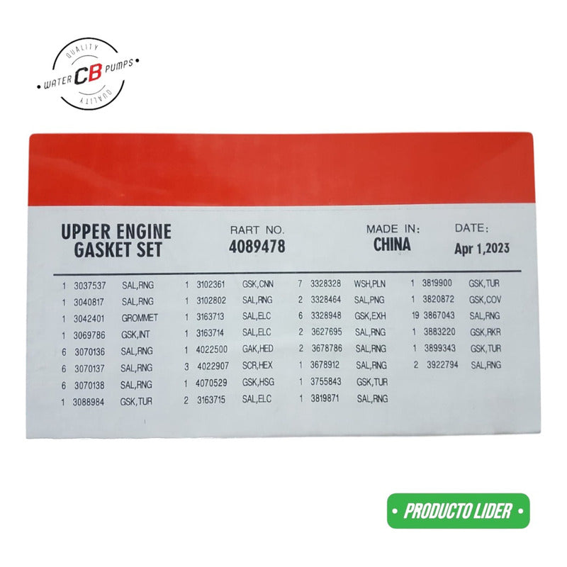 JUEGO DE JUNTAS SUPERIOR CALIDAD PREMIUM Mejora la vida útil de tu Camión. •Mayor durabilidad. •Envío Gratis a Todo el País. •Compra 100% Segura. Para que su compra sea una buena experiencia sugerimos observar los siguientes puntos: 1.- COMPATIBILIDAD DE LA PIEZA • Revise que la pieza sea compatible con su vehículo, compare con las fotos e información publicadas. 2.- TIEMPO DE ENTREGA • Dependiendo de su Localidad es el tiempo de recepción del producto. • Ingresa tu Código Postal para saber el Tiempo y formas de Envío. • La logística, tiempos de entrega y la paquetería, dependen de Mercado Libre. 3.- FACTURA • Al recibir su producto puede generar su factura en línea (Le enviamos su link en el chat de compra). 4.- DEVOLUCIONES • La pieza debe venir en buen estado y con todos los aditamentos incluidos. • No se aceptan devoluciones si ya fue instalada o usada en su auto. Somos Central de Bombas con 50 años de experiencia. • Especialistas en Venta de Bombas de Agua Automotrices. • Para Motores Diesel y Gasolina. • Todas las Marcas y Aplicaciones (Autos, Camiones, Montacargas, Plantas de Luz, Tractores).