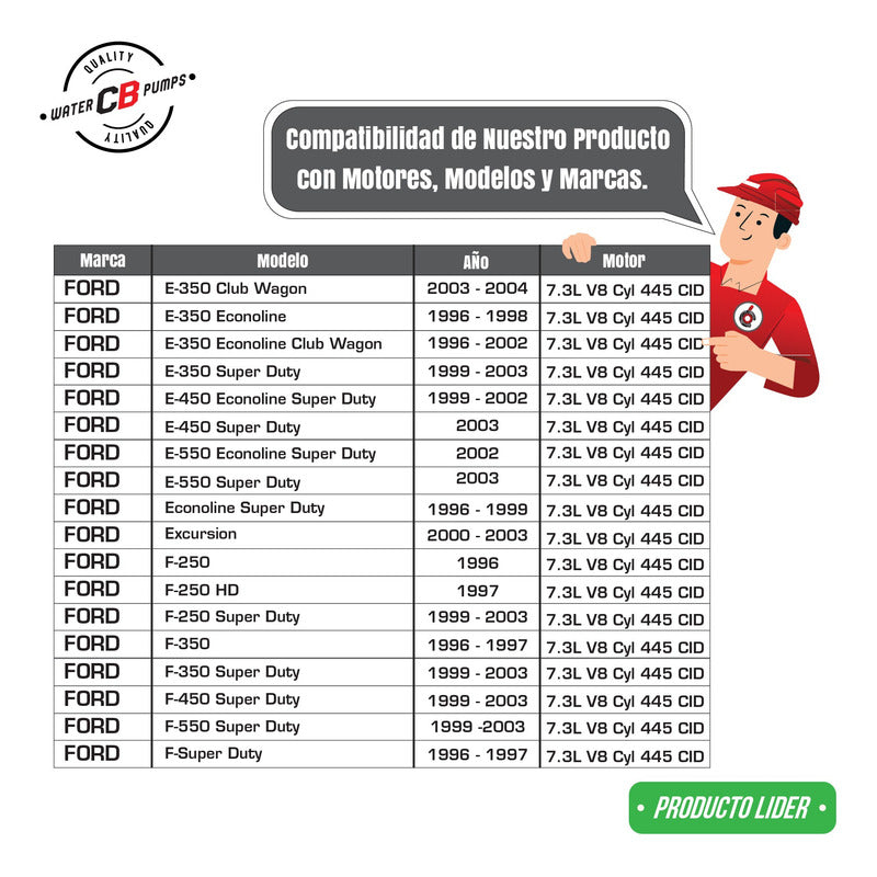 Modelo: Ford E-350 E-450 E-550 Econoline Super Duty 7,3 l V8 F-250 F-350 F-450 F-550 Super Duty 1996-2003 V8 7,3 l