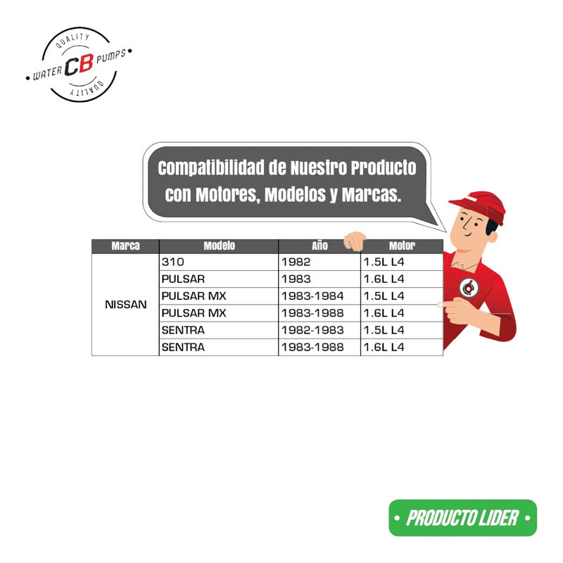 CENTRAL DE BOMBAS BOMBA DE AGUA NUEVA CALIDAD PREMIUM Gracias por visitarnos, estamos a sus órdenes. Le recomendamos revise que la pieza sea compatible con su auto, apoyándose de las fotos mostradas en la publicación. Si tiene duda, pregúntenos estamos para atenderlo. Somos una empresa Especialista en Venta de Bombas de Agua nuevas para motores Diesel y Gasolina para todas las marcas y aplicaciones (automóviles, tractocamiones, montacargas, plantas de luz, tractores, maquinaria pesada, entre otras) más de 45 años de experiencia nos respaldan. Nuestro objetivo es dar a nuestros clientes seguridad, confianza, calidad y servicio. ENVIO La mayoría de nuestras publicaciones cuenta con envío gratis, sin embargo, si el producto no cuenta con él, usted mismo puede calcularlo ingresando su código postal. Por favor revise en la publicación junto al precio del producto, ahí se especifica si el producto cuenta con envío gratis o tiene algún costo y puede escoger el tipo de entrega (a domicilio o en sucursal de correo). La tardanza del envío depende de la carga de trabajo de la paquetería, días festivos y el destino al que viaje, usted mismo puede calcularlo ingresando su código postal para que le proporcionen una estimación más cercana a su región. Por lo general, en ciudades grandes del país tarda de 24-48 hrs. Considere que la mayoría de las paqueterías realizan las entregas en días hábiles. GARANTÍA Todos nuestros productos tienen garantía contra cualquier defecto de fábrica o mal funcionamiento, válida por 60 días (a partir de que reciba su producto). Material roto, mojado, quemado, con presencia de oxidación y/o sarro invalida la garantía. FACTURA Si facturamos. Pregunte a nuestro asesor. Gracias por visitar nuestro portal. Queremos que su compra sea una buena experiencia.